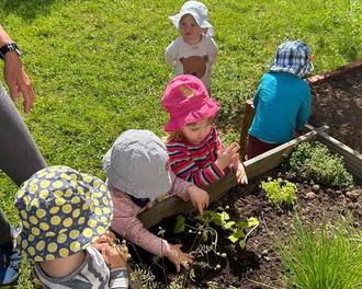 Wenn die Sommersonne warm vom Himmel lacht, wird im Garten alles schöngemacht. Putzen, kehren, hacken, mähen, graben, pflanzen, gießen, säen, schneiden, jäten, pflegen, ernten und noch viele andre Sachen sind im Garten jetzt zu machen. Alle packen kräftig an, damit man später ernten kann. Die Pflänzchen und Ableger sind wirklich toll und machen unsere Beete voll. Wir werden beobachten und lernen um später Obst, Gemüse und Kräuter zu ernten.