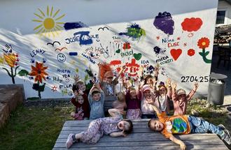 Mit viel Begeisterung und Kreativität wurde eine Seite der angrenzenden Garage farbenfroh gestaltet. Die Kinder durften ihrer Fantasie freien Lauf lassen und haben den Platz damit um ein fröhliches, bleibendes Kunstwerk bereichert.