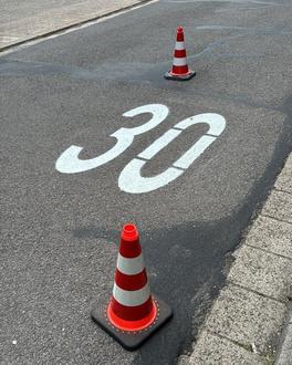 Und noch eine kleine Neuigkeit: Wegen einiger Beschwerden, dass das „30“-Schild schlecht sichtbar wäre, wurde nun kurzfristig von der Gemeinde auch eine Markierung auf der Straße aufgebracht.