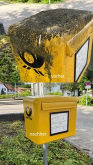 Wie neu sieht der Briefkasten in der Ortsmitte aus, nachdem er gründlich von mir gereinigt wurde. Hierbei fand ich tatkräftige Unterstützung durch Kerstin Jenet-Molter. In diesem Zusammenhang schrubbten wir auch noch den Mülleimer, der in der Nähe des Briefkasten hängt.