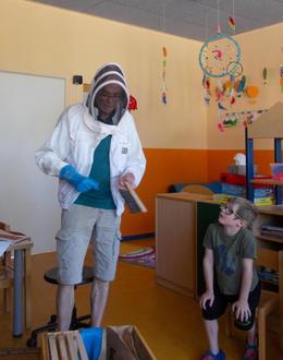 Gemeinsam mit den diesjährigen Wackelzahnkindern sowie den "neuen" Vorschulkindern 2022/2023 bearbeiteten wir das Thema Bienen. Wir luden Herrn Horst Krammes zu uns in die KiTa ein. Er ist ein echter Profi was Bienen und die Herstellung von Honig angeht. Am 04.07.22 besuchte uns Herr Krammes im Kindergarten. Er erklärte uns alles Wissenswerte rund um die Biene. Hatte sogar eine richtige Imkerausrüstung dabei. Wir erfuhren viel über die fleißige Honigbiene und was man zur Honiggewinnung alles braucht.
