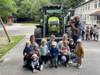 Passend zum derzeitigen Projektthema “Bauernhof“ der Krippengruppe „Burgmäuse“ führte Volker Röhrig aus Bosen seinen Traktor vor. Nach anfänglichem Zaudern und respektvollem Abstandhalten zu diesem großen Gefährt und seinem Besitzer wurden die Kleinsten zusehends mutiger, den Traktor näher in Augenschein zu nehmen und auch mit einer Erzieherin oder auf dem Arm von Herrn Röhrig aufzusteigen und probezulenken! Dieses Angebot ließen sich natürlich auch die später hinzugerufenen Kindergartenkinder nicht entgehen und kletterten eifrig und mit leuchtenden Augen auf die große grüne Landmaschine.