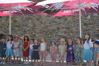 Singfreudige Kinder der Kindertagesstätte Nohfelden haben in diesem Jahr das Programm des Burgfestes mit der Darbietung einiger Lieder bereichert. Der knapp 15 Minuten dauernde Auftritt der Kinder hat ihnen und ihren Erzieherinnen im Vorfeld Einiges an Konzentration und Ausdauer abverlangt, wurden doch Lieder wie „Beim Sommerfest auf der Wiese“ und „Das Lied über mich“ eigens für diesen Tag gruppenübergreifend eingeübt. Familien, die Zeit und Lust hatten, ihre Kinder zu diesem Auftritt am Burgfest zu begleiten, haben sich im Vorfeld in der Kinderburg angemeldet, um an diesem sehr sonnigen Sonntag zum Gelingen der musikalischen Darbietung beizutragen. Und so haben sich wochenlanges Üben und akutes Lampenfieber der Kinder letztlich zu einem spaßbetonten und gelungenen Auftritt gewandelt :-)