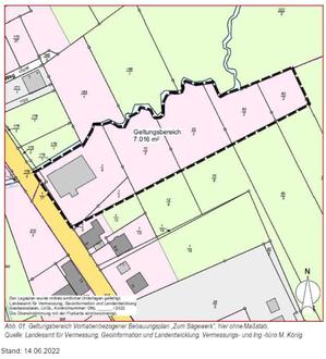 Die genauen Grenzen des Geltungsbereiches des vorhabenbezogenen Bebauungsplanes sind dem beigefügten Lageplan zu entnehmen. Er umfasst eine Fläche von ca. 0,7 ha.