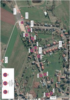 | 1. | In der Römerstraße wird von Einmündung St. Wendeler Straße bis Sportplatz und in der Gegenrichtung je eine Geschwindigkeitsbeschränkung von 30 Km/h angeordnet. Hierzu sind beidseitig die VZ 274-30 (30km/h) StVO zu zeigen. Zusätzlich sind die VZ 101 StVO (Gefahrenstelle) mit dem Zusatz „Veranstaltung“ zu zeigen. |