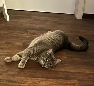 Die Katze ist grau/schwarz gefleckt und hat einen auffallend schwarzen Streifen auf dem Rücken, der bis in die Schwanzspitze reicht.