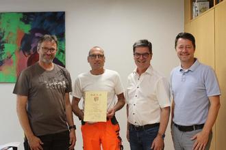 Überreichung der Urkunde durch Bürgermeister Andreas Veit mit Volker Leid (Leiter Bauhof), Markus Presser (Mitarbeiter Bauhof) und Peter Rosenau (Personalleiter) / Foto: Gemeinde Nohfelden