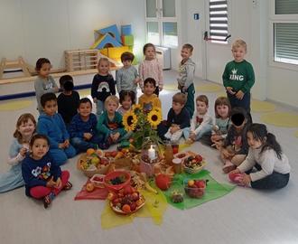 Am Mittwoch, den 02.10.2024 feierten die Kinder der KiTa Wolfersweiler erstmalig das Erntedankfest. Jedes Kind hatte für die Feier reichlich Obst und Gemüse von zu Hause mitgebracht. Dieses legten die Kinder gemeinsam mit unserem selbstgebackenen Brot in der Kreismitte aus. Im Bistro hatten die Kinder anschließend die Möglichkeit, das Obst und Gemüse zu probieren. Wir bedankten uns bei der Sonne für ihre warmen Sonnenstrahlen, bei dem Regen für seine Regentropfen und bei der Erde für den guten Boden.