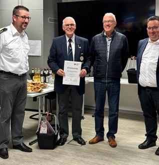 Landrat Udo Recktenwald, überreichte in einer kleinen Laudatio, Raimund Backes die Urkunde für 50 Jahre aktiver Mitgliedschaft, durch die Präsidentin des DRK Gerda Hasselfeld, sowie die DRK Ehrennadel. Ebenso wurde er zum Ehrenbereitschaftsleiter ernannt.