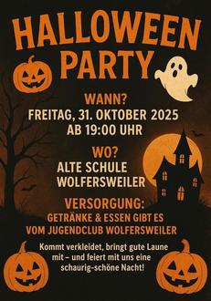 Der Jugendclub Wolfersweiler lädt herzlich zur Halloweenparty auf dem alten Schulhof ein. Alle sind willkommen, um gemeinsam ein schaurig-schönes Fest zu feiern.