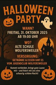 Der Jugendclub Wolfersweiler lädt herzlich zur Halloweenparty auf dem alten Schulhof ein. Alle sind willkommen, um gemeinsam ein schaurig-schönes Fest zu feiern.