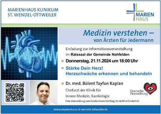 Unter dem Motto „Stärke dein Herz! Herzschwäche erkennen und behandeln“ wird Dr. med. Bülent Tayfun Kaplan, Chefarzt der Inneren Medizin, Kardiologie im Marienhaus Klinikum St. Wendel-Ottweiler, einen Vortrag halten. Diese informative Veranstaltung findet im Ratssaal der Gemeinde Nohfelden statt.