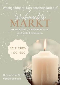 Am morgigen Samstag, dem 22.11., veranstaltet die „Wachsbildnerei Kerzenschein“ in ihren Geschäftsräumen ab 11:00 Uhr eine Adventsausstellung in Verbindung mit dem traditionellen, gemütlichen und überdachten Selbacher Weihnachtsmarkt in der Straße Zum Reiterbruch.