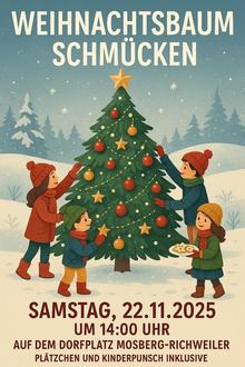 Am Samstag, 22.11.2025 wollen wir wieder mit den Kindern aus Mosberg unseren großen Weihnachtsbaum auf dem Dorfplatz schmücken. Los geht es um 14:00 Uhr. Natürlich sind auch wieder ausreichend Plätzchen und Kinderpunsch kostenfrei vorhanden.