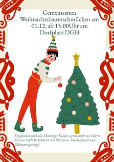 Am Sonntag, 1. Advent (01.12.2024) sind alle Kinder aus Mosberg-Richweiler, ab 15:00 Uhr zum Weihnachtsbaumschmücken am Dorfplatz herzlich eingeladen. Natürlich haben wir auch warme, kostenfreie Getränke für Euch.