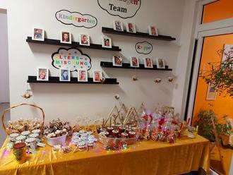 Vom 25.11.24-29.11.24 fand in diesem Jahr erstmalig ein Adventsbasar in der KiTa Selbach statt. Die Eltern und Großeltern hatten täglich die Möglichkeit, weihnachtliche Basteleien, Leckereien und Kreatives zu erwerben. Im Vorfeld wurde gemeinsam mit den Kindern gebacken, gemalt und gewerkelt. Die Kinder stellten stolz eigene Produkte her und wurden hierbei durch die Erzieher/innen unterstützt. Auch stellte das Personal in mühevoller Arbeit eigene Produkte her. So konnten letztendlich Vogelfutterglocken, Mistelzweige, Holztannenbäume, bemalte Weingläser, Rentierkakao, Cookiegläser, Plätzchen, Bruchschokolade, Winterpflaumemarmelade, frischgebackenes Brot, Weihnachtsgranola, Zucker-Öl-Peeling, gebrannte Mandeln, Duftringe und vieles mehr angeboten werden. Das Sortiment war wirklich breit gefächert und es konnte während der Kitaöffnungszeiten nach Herzenslust gestöbert und gekauft werden. So wurde bereits jetzt so manches Weihnachtsgeschenk erworben. Die Stimmung war während der gesamten Woche voller Weihnachtsvorfreude und machte Lust auf die anstehende Adventszeit. Abgerundet wurde das Ganze durch ein Adventscafe am Mittwoch, den 27.11.24. An diesem Tag konnte bei weihnachtlicher Musik, Kaffee und Kuchen ein wenig geplaudert werden.