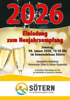 Der Neujahrsempfang des Ortsrates findet am Sonntag, 04.01.2026, ab 10:30 Uhr im Gemeindehaus statt. Gesangliche Leckerbissen werden von der Herrenrunde Sötern sowie Natalie Ruppenthal vorgetragen. Für das leibliche Wohl mit kalten und warmen Getränken sowie Snacks ist natürlich ebenso gesorgt. Die Bevölkerung ist herzlich eingeladen.