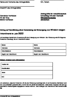 Die Anträge mit den dazugehörigen Anlagen müssen unter Verwendung der Formblätter „Babywindeln“ oder „Inkontinenz“ gestellt werden und sind mit dem Vermerk „Windelentsorgung“ im verschlossenen Umschlag bis spätestens 31.03. des auf das Abrechnungsjahr folgenden Jahres einzureichen.