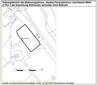 Der Gemeinderat hat am 04.09.2025 – öffentlicher Teil - den Bebauungsplan „Neubau Feuerwehrhaus Löschbezirk Mitte“ in Flur 1 der Gemarkung Walhausen gemäß § 10 Abs. 1 Baugesetzbuch (BauGB) in der Fassung der Bekanntmachung vom 03. November 2017 (BauGB), in der Fassung der Bekanntmachung vom 03. November 2017 (BGBl. S. 3634), unter Berücksichtigung der aktuell gültigen Änderungen, als Satzung beschlossen.
