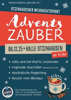 Zum vierten Mal in Folge wird UVO (Unser Verein Otzenhausen) am 06.12. ab 15:00 Uhr die Hunnenringhalle und ihren Vorplatz in ein kleines, liebevoll gestaltetes Winterwunderland verwandeln. Dann öffnet der „Adventszauber“ wieder seine Türen – ein Weihnachtsmarkt, der mit viel Herzblut organisiert wird und Jahr für Jahr zahlreiche Besucher anzieht.