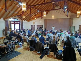 Pause: Plakate und Flyer werden an die Musiker verteilt, zum Aufhängen bzw. Austeilen. Wer möchte, kann Karten für den Vorverkauf mitnehmen. Schnell noch ein Getränk fassen und weiter geht es mit dem zweiten Teil der Probe: I shall love but thee, die nächste Gesangsnummer mit Martina Veit: technisch nicht so anspruchsvoll, wenn da nicht die vielen Kreuze wären! Zum Schluss noch ein Durchlauf von Hermitage, hier werden die Bilder einer Ausstellung musikalisch beschrieben: das Grobe steht, im Detail muss noch geprobt werden – aber nicht mehr heute. 12:10: Die Probe endet mit zehn Minuten Verspätung.