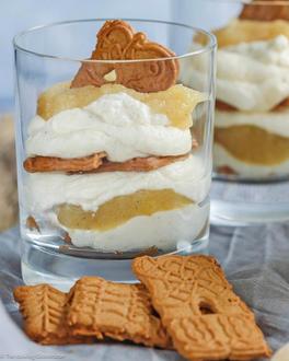 In die Gläser nun ca. 2 EL der Creme füllen, glattstreichen. Darauf eine Schicht Apfelmasse geben. Dann wieder mit 1 - 2 EL Creme abdecken. Anschließend ca. 3 cm Spekulatiusbrösel einfüllen. Die restliche Creme auf alle Gläser aufteilen, wieder glattstreichen. Pro Glas wird eine Schoko-Dekor-Figur eingesteckt. Außerdem den Rest der Spekulatiusbrösel auf die Gläser verteilen.