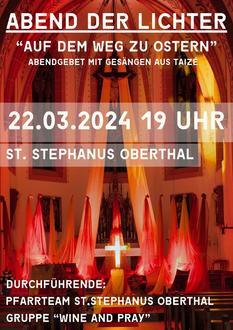 | St. Stephanus, Oberthal | 19.00 | Abend der Lichter „Auf dem Weg zu Ostern“ Abendgebet mit Gesängen aus Taizé |