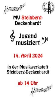 Am Sonntag, den 14.04.2024, veranstaltet der Musikverein Steinberg-Deckenhardt ab 14:00 Uhr in der Musikwerkstatt sein „Jugend musiziert“. Hierbei zeigt sich die gesamte Jugendausbildung des Vereins, von der musikalischen Früherziehung über die Grundausbildung bis hin zur Instrumentalausbildung und das SchülerOrchester des MV Steinberg-Deckenhardt (SOS). Die Kinder und Jugendlichen freuen sich, ihr Können vor Publikum zu präsentieren.