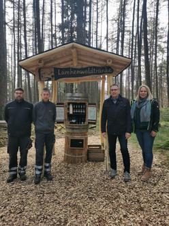 beginnend zum Start ins Frühjahr und in die Wandersaison hat die Gemeinde Oberthal auf dem „Rötelsteinpfad“ mit einem Weinschrank, der „Lärchenwaldtränke“, eine neue Attraktion zu bieten. Am Montagmorgen war ich mit meiner Mitarbeiterin Nadine Stemmler von der Liegenschaftsabteilung und den beiden Kollegen vom Gemeindebauhof, Sascha Tritz und Bernd Rimpel, auf dem Leisberg, um offiziell für alle Wanderfreunde die Anlage zur Nutzung freizugeben. Die Ursprungsidee, einen Weinschrank entlang des Rötelsteinpfades einzurichten, stammt von unserem Mitarbeiter beim Gemeindebauhof, Herrn Sascha Tritz. Die verantwortlichen Mitarbeiter im Bauamt und beim Bauhof haben sich sodann zusammengesetzt und eine gemeinsame Entwurfsplanung für dieses touristische Angebot erarbeitet.
