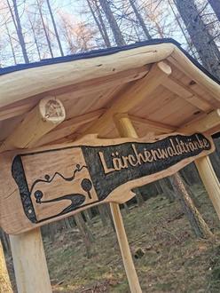 Mit unserem Mitarbeiter Bernd Rimpel verfügen wir beim Gemeindebauhof über einen versierten Schreiner und es war dann sein Aufgabenbereich, den Schrank samt Unterstand zu bauen. Natürlich hat sich stets auch eine helfende Hand unter den Kollegen gefunden, wenn weitere Mitarbeiter zum Anpacken gebraucht wurden, wie zum Beispiel beim Aufbau des Unterstandes. Das Schild „Lärchenwaldtränke“ hat die Gemeinde Oberthal bei Herrn Andrej Löchel in Auftrag gegeben. Er hat schon andere touristische Attraktionen für den Rötelsteinpfad hergestellt und uns war es wichtig, auch hier bei der Lärchenwaldtränke den einheitlichen „Rötelsteinpfad-Look“ beizubehalten. Eine Theke und eine Sitzgarnitur laden die Wanderer an diesem schönen Platz zum Verweilen ein.