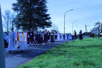 29 Mädchen und Jungs aus der Pfarreiengemeinschaft Oberthal-Namborn gingen in St. Donatus Gronig zur Ersten Heiligen Kommunion. Nach Monaten langer Vorbereitung durch unseren Gemeindereferenten Peter Holz unter dem Motto „Mit Jesus unterwegs“ zogen die Kinder, bei strahlendem Sonnenschein und Musikbegleitung, vom Dorfgemeinschaftshaus in die Kirche ein, wo ein feierlicher Gottesdienst, unter Leitung von Pater Ignas gefeiert wurde. Nach den Glückwünschen an die Kommunionkinder und der Einladung zur Gemeinschaft den Ort Kirche zu besuchen, hat der Pfarrgemeinderat und Verwaltungsrat die Gäste zum kurzen Verweilen und einem kleinen Umtrunk vor der Kirche eingeladen bevor es zu den Feiern in den Familien ging. Es war ein schöner Morgen der den Kindern und auch den Erwachsenen noch lange in Erinnerung bleibt. Der Pfarrgemeinderat und Verwaltungsrat bedankt sich bei Peter Holz für die lange und intensive Vorbereitung, bei Pater Ignas, dem Musikverein Gronig, dem Organisten Matthias Demuth, der Solistin Lena König, der Küsterin und den Messdienern und allen helfenden Händen.