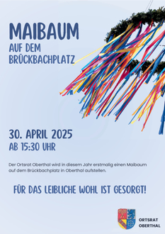 Der Ortsrat von Oberthal hat sich dazu entschlossen, in diesem Jahr erstmalig am 30. April einen Maibaum auf dem Brückbachplatz aufzustellen. Ab 15.30 Uhr werden Rostwürstchen und Kaltgetränke angeboten.