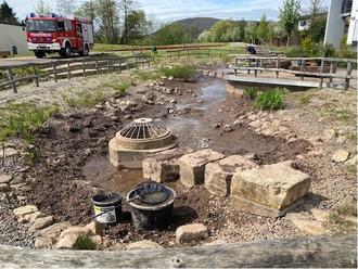 Durch das in den Teich eingeleitete Wasser des Bachlaufes gelangen auch stetig feinste Segmente und Materialien in die Wasserfläche und setzen sich dann am Boden des Wassergartens ab. Das führt zur Eintrübung des Wassers und einer zunehmenden Verschlammung und Anhäufung von Erdmassen. Nach dem Ablassen des Wassers musste der angehäufte Schlamm mühsam aus dem Becken abgetragen und entfernt werden, bevor nach Abschluss dieser Arbeiten mit Unterstützung unserer Mitarbeiter bei der Feuerwehr die Teichanlage wieder neu befüllt werden konnte.