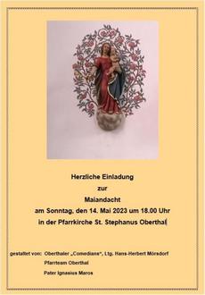 | St. Stephanus, Oberthal | 18.00 | Maiandacht gestaltet vom Männerchor Oberthal und dem Pfarrteam Oberthal |