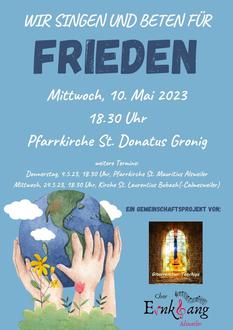 | St. Donatus, Gronig | 18.30 | Friedenskonzert „Singen und Beten für den Frieden“ Mitwirkende: Gitarrenchor Teachips und Chor Einklang Alsweiler |