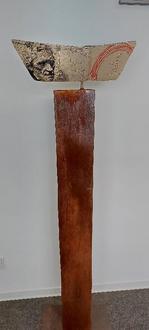 Wir hoffen nun, auf diesem Wege den Gewinner dieses außergewöhnlichen Stückes aus dem Atelier Feuerland finden zu können. Es handelt sich um ein druckverziertes Schiff auf einer etwa 1,40 m hohe Metallstele.