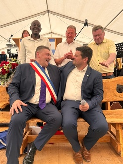 Der Tag darauf begann mit einer schönen feierlichen Eröffnung durch unseren Pater Ignasius Maros und dem Team des Pfarrgemeinderates St. Donatus Gronig, bevor der Festkommers losging. Das Festzelt war bis auf den letzten Platz belegt. Man konnte sogar schon zunehmend verfolgen, wie sich das Gelände immer mehr mit Menschen gefüllt hat. So macht auch ein Festkommers Spaß und im Vorfeld waren sich Jean und ich einig, unsere Reden gleichzeitig und identisch vorzutragen. Immer abwechselnd auf Deutsch und Französisch. So taten es auch in Vertretung der Schirmherrin Anke Rehlingers unser Gesundheitsminister Dr. Magnus Jung und der 1. Beigeordnete Uwe Schäfer. Begleitet durch unsere Chorgemeinschaft Oberthal-Gronig, dem Musikverein aus Moyenmoutier und unserem Musikverein „Harmonie“ Gronig war es eine runde Sache geworden.