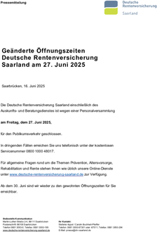 Die Deutsche Rentenversicherung Saarland einschließlich des Auskunfts- und Beratungsdienstes ist wegen einer Personalversammlung am Freitag, dem 27. Juni 2025, für den Publikumsverkehr geschlossen.