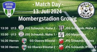 Am Kirmessamstag finden auf dem Sportplatz in Gronig ab 13.30 Uhr zwei Jugendspiele der U13 sowie im Anschluss ab 16.30 Uhr zwei Spiele der beiden aktiven Mannschaften statt. Auch hier ist jeder herzlich willkommen, wobei für Essen und Trinken natürlich von der FSG Gronig-Oberthal gesorgt wird.