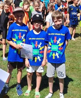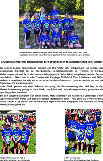 Bei extrem heißen Temperaturen nahmen am 19.07.2022 zehn Schülerinnen und Schüler der Grundschule Oberthal bei der Saarländischen Schulmeisterschaft im Triathlon im Freibad Wallerfangen teil, welche in den unteren Jahrgängen als Swim & Run ausgetragen wurde. Getreu dem Motto. „Dabei sein ist alles!“ hatten die Jahrgänge 2013/2014 50m Schwimmen und 500m Laufen zu bewältigen. Für alle war es der erste Wettkampf dieser Art - um so beachtlicher sind die Ergebnisse, die erreicht wurden: