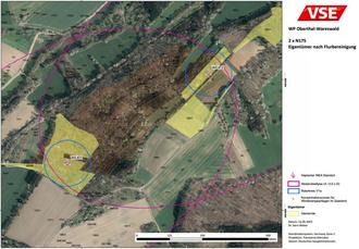 Damit eine Konzentrationszone vollumfänglich zu den Flächenbeitragswerten nach § 3 WindBG angerechnet werden kann, muss es erlaubt sein, dass die Rotorblätter die Grenze der Konzentrationszone im Bedarfsfall überschreiten. Dies kann die Gemeinde durch einen einfachen Beschluss herbeiführen. Dadurch werden die derzeit bestehenden Rotor-innerhalb-Flächen zu sog. Rotor-außerhalb-Flächen. Bezüglich der Konzentrationsfläche „Wareswald“ erläuterte in der Sitzung des Gemeinderates Herr Dr. Frank Schmeer, (Vertreter der VSE) dies sehr anschaulich. Bei den Ausführungen zeigte er den anwesenden Ratsmitgliedern und einigen mitanwesenden interessierten Bürgern auf, dass es aufgrund einer solchen Beschlusslage dann auch möglich wäre, auf Flächen die im Eigentum der Gemeinde Oberthal aufstehen (die Gemeindeflächen sind in der nachstehenden Abbildung gelb markiert), zwei Windkraftanlagen im Bereich „Wareswald“ zu realisieren. Die Planung sieht vor, dass die Anlagen selbst größtenteils auf Gemeindeflächen aufstehen. Bezüglich der Flächenareale, welche von den Rotorblättern überflogen werden oder bezüglich Parzellen, die als Wegezuführung oder als Kranstellfläche benötigt werden, müssen zur Realisierung des Projektes allerdings noch weitere, im Eigentum von Privatpersonen befindliche Parzellen beansprucht werden. Insofern ist eine tatsächliche Umsetzung des Windparks „Wareswald“ auch von der Bereitschaft der betroffenen privaten Grundstückseigentümer abhängig.