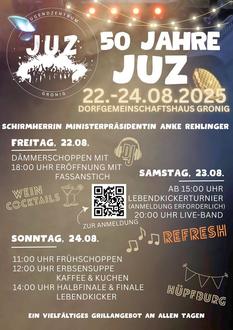 Das Jugendzentrum Gronig feiert in diesem Jahr sein 50-jähriges Bestehen – und lädt vom 22. bis 24.08.2025 herzlich zum großen Jubiläumswochenende am Dorfgemeinschaftshaus Gronig ein.