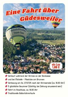 Am Kirmessonntag, 27. Juli 2025, gegen 18:00 Uhr startet ein Heißluftballon in Güdesweiler – und DU kannst mit dabei sein!