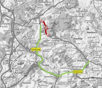 Die Umleitung dazu erfolgt über die L 133 und L 135 durch Winterbach bzw. Tholey, Theley bis nach Selbach. Die Umleitung der Gegenrichtung wird entsprechend umgekehrt ausgeschildert.