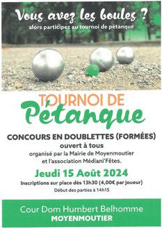 Unsere Partnergemeinde Moyenmoutier veranstaltet am 15. August (Maria Himmelfahrt) ein offenes Pétanque-Turnier. Beginn der Anmeldung ist ab 13.30 Uhr, Spielbeginn ist um 14.15 Uhr. Gespielt wird in Doublettes formées, also je zwei Spieler à drei Kugeln. Eine spezielle vorherige Anmeldung ist nicht notwendig. Es genügt die Anmeldung vor Ort. Die Freunde aus Moyenmoutier laden alle Bürgerinnen und Bürger der Gemeinde Oberthal herzlich ein.