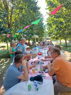 An der langen Tafel in der Lindenallee vor der Abtei picknickten wir mit unseren französischen Freunden, die sich alle Mühe gegeben hatten, uns einen unvergesslichen Tag zu bereiten. Und das ist ihnen rundum gelungen. Man saß schattig und genoss die schönen gemeinsamen Stunden. Angeboten waren auch eine Führung durch die Abteikirche, ein Spaziergang und ein gemeinsames Boulespiel. An einem solchen Tag spürt man, was in vier Jahrzehnten an Freundschaft gewachsen ist. Viele schwelgten in Erinnerungen, andere tauschten sich zu Aktuellem aus beiden Gemeinden aus, wiederum andere machten Pläne für die Zukunft. All dies fand seinen Ausdruck in dem Lied, das einige Oberthaler und einige Médianimonastériens (so ist die offizielle Bezeichnung der Einwohner von Moyenmoutier) zum Abschied sangen: