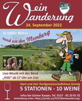 Der Herbst ist da und einige Veranstaltungen und Feste stehen noch an. So wird der FC Gronig e.V. am 24.September seine 3.Weinwanderung unter dem Motto „in toller Natur, rund um den Momberg“ veranstalten. An 5 Stationen werden 10 leckere Weine angeboten mit viel Auswahl an Snacks und Essen. Als Ehrengäste ist die neue Saarländische Weinkönigin Katharina I und Weinprinzessin Maren Suffel mit von der Partie. Die beiden werden wieder die Gäste in Empfang nehmen und an den Stationen den saarländischen Wein repräsentieren und mit den Leuten ins Gespräch kommen. Im Anschluss spielt noch die Band „HSG“ am DGH.