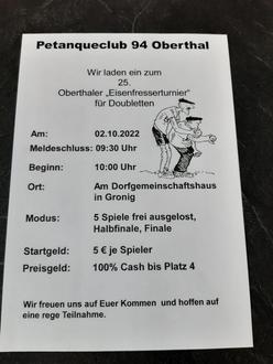 Weiter geht es am 02.10.2022 mit dem „Eisenfresserturnier“ des Pétanque Club 94 Oberthal am DGH. Der Verein konnte nach dem Erhalt der Förderung durch das Umweltministerium mit dem Vorhaben zur Erweiterung der Bouleflächen beginnen. Sehr viele Mitglieder packten mit an, um den Platz rechtzeitig fertig zu stellen und ich muss sagen es sieht sehr gut aus. Nun hat jeder die Möglichkeit sich von der Umsetzung selbst zu überzeugen und wer dann auch möchte darf gerne regelmäßig eine Runde Boule spielen.