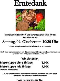 Das Pfarrteam St. Stephanus Oberthal gestaltet auch in diesem Jahr den Erntedankaltar in der Pfarrkirche Oberthal. Im Anschluss an den Gottesdienst bieten die Mitglieder den Gottesdienstbesuchern noch eine Kürbissuppe vor der Kirche an.