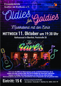 Der FKR e. V. hat die THE EARLS, die älteste OLDIE-BAND des Saarlandes zu einem Konzert in unseren Rathaussaal eingeladen. Die Band bietet bei ihren Konzerten NOSTALGIE pur, bekannte Songs der 60iger-/80iger Jahre. Neben den „Ohrwürmern“ stehen auch aktuelle Stücke und Eigenkompositionen auf ihrem Programm. Den Konzertabend am